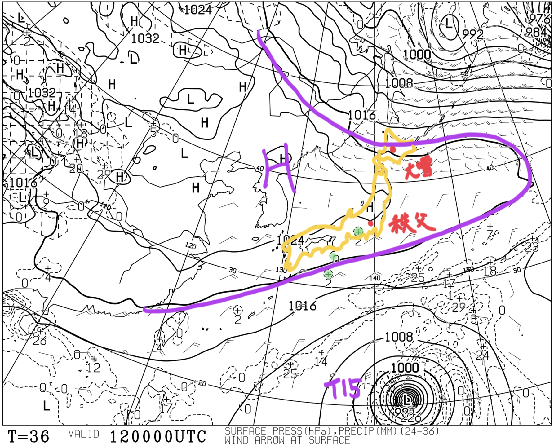 日々の天気図解析 2023/10/12 09:00の予想天気図:大雪・秩父