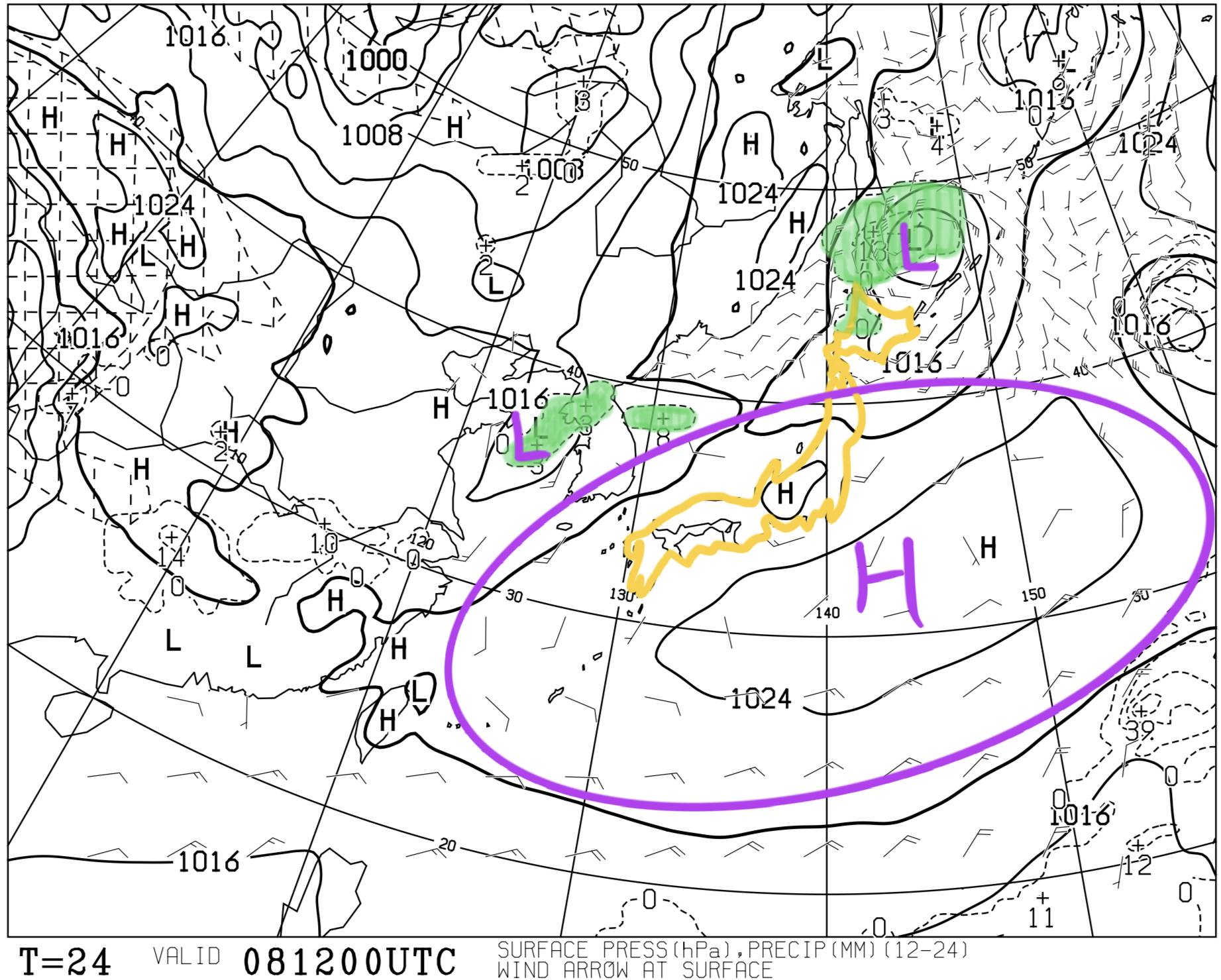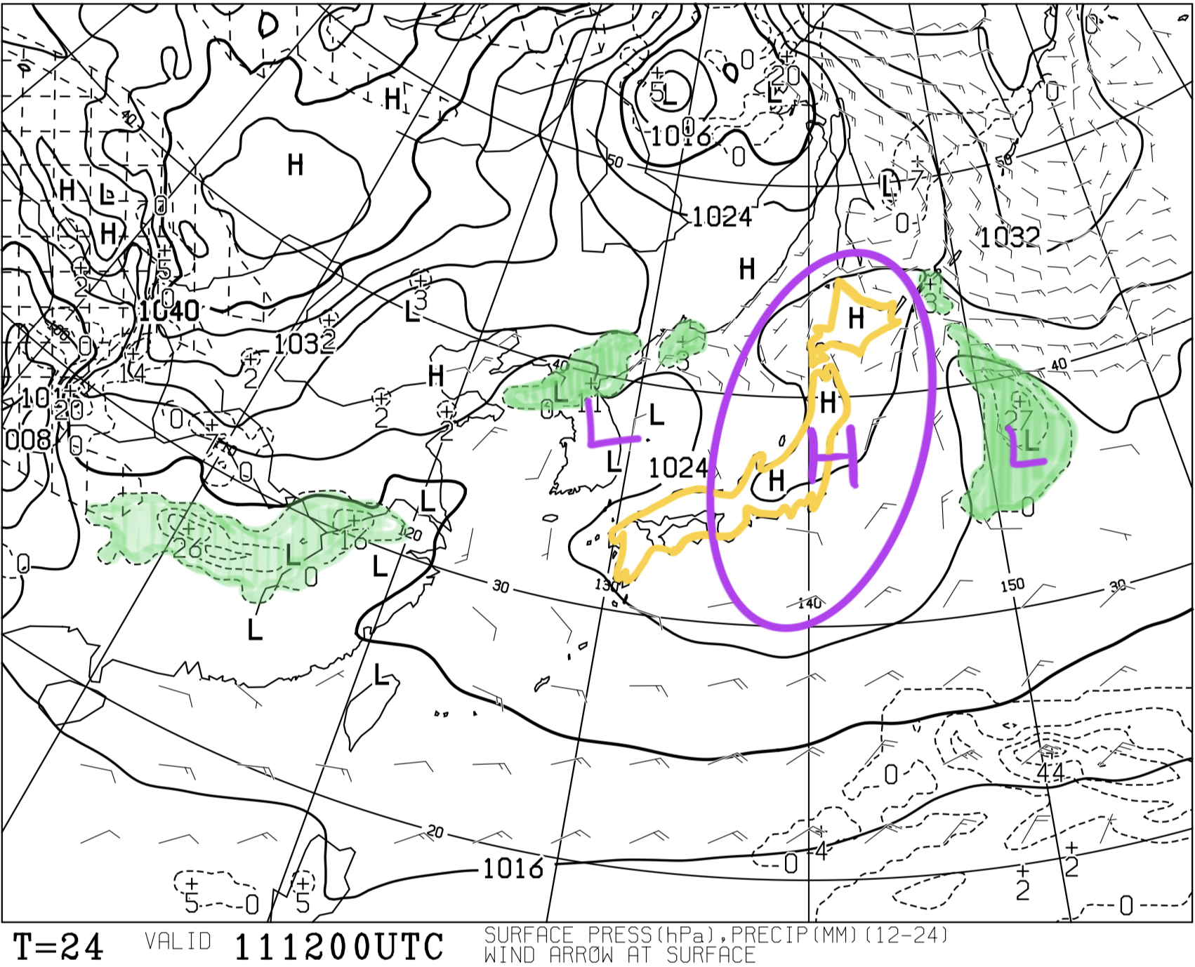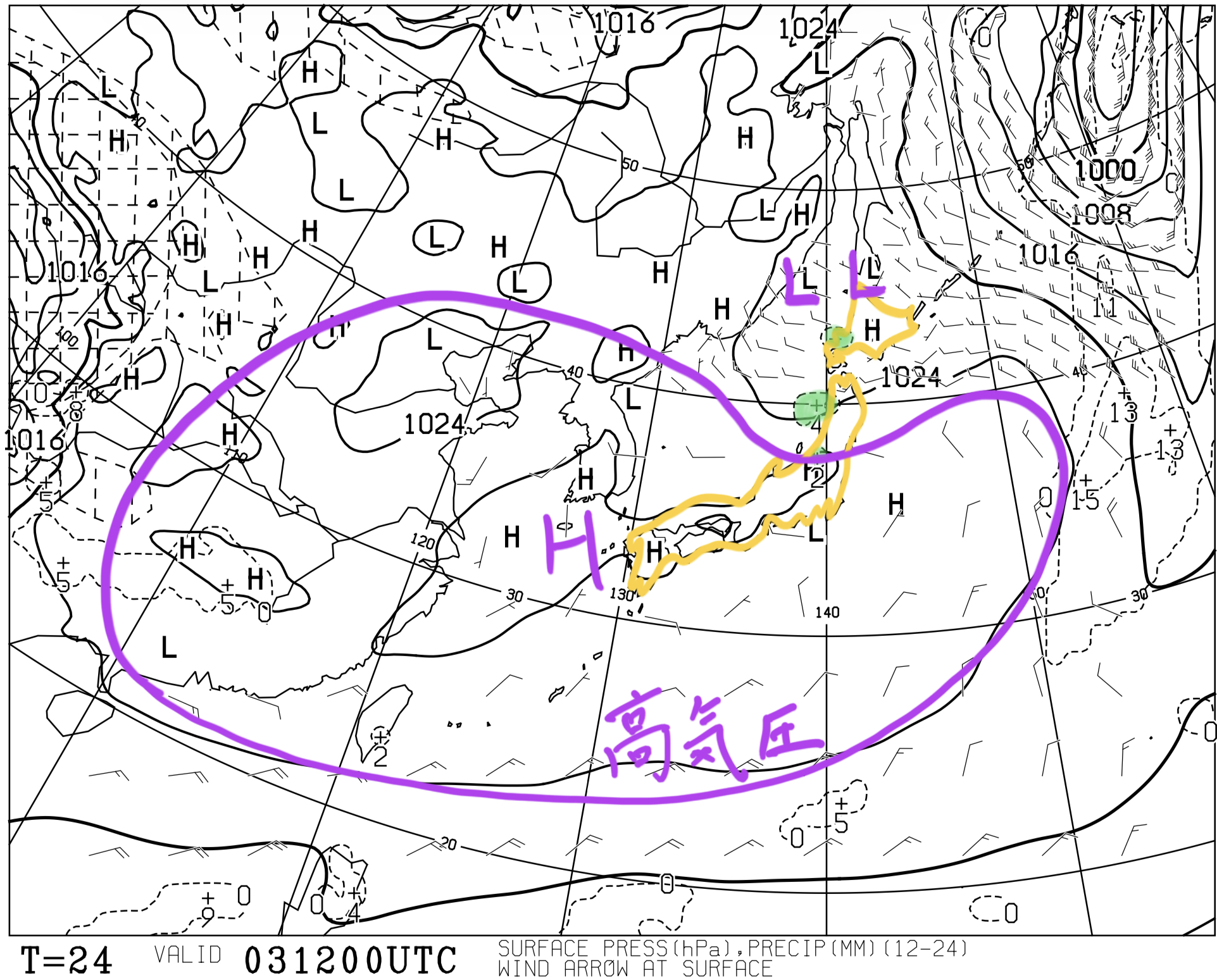 全国的に晴れ。地上(等圧線・前12時間降水量)低気圧と高気圧が交互に通過している。週末は高気圧が覆うが、日曜日の夜から下り坂に転じる見込み。850 hPa(等相当温位線・風)日本列島は高気圧にすっぽり覆われる。高気圧の東西には風向が急激に変...
