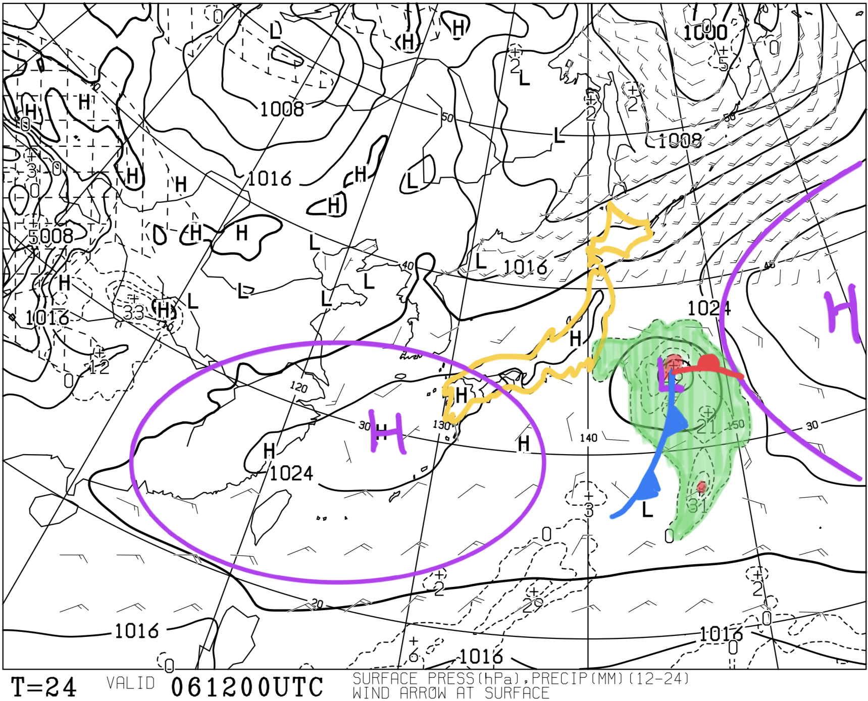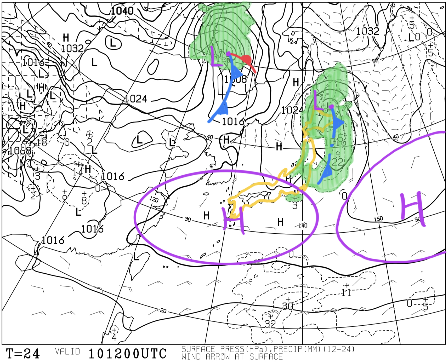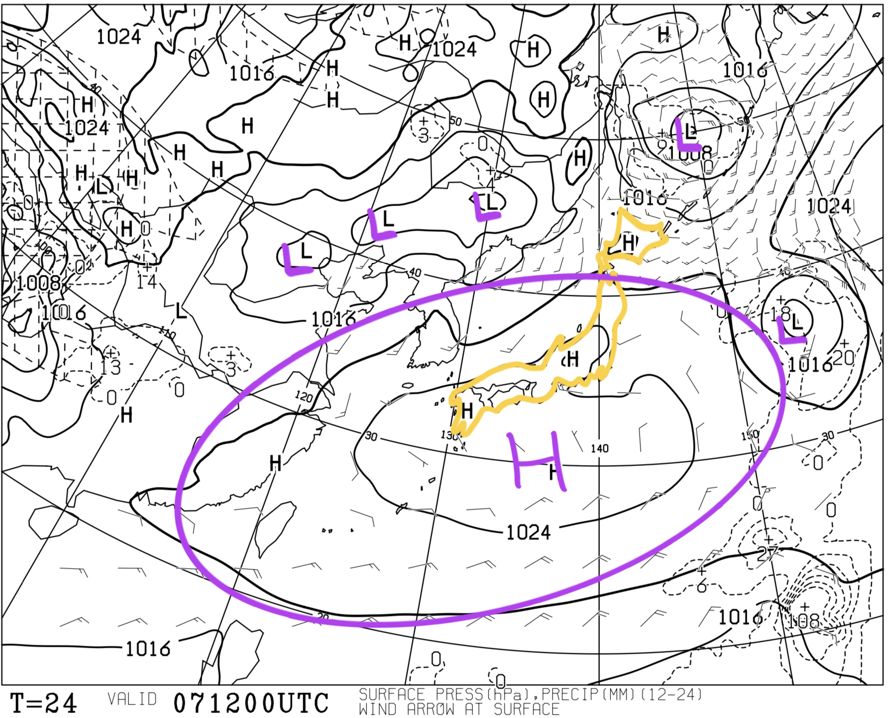 全国的に晴れ。地上(等圧線・前12時間降水量)低気圧と高気圧が交互に通過している。週末は高気圧が覆うが、日曜日の夜から下り坂に転じる見込み。850 hPa(等相当温位線・風)日本列島は高気圧にすっぽり覆われる。高気圧の東西には風向が急激に変...