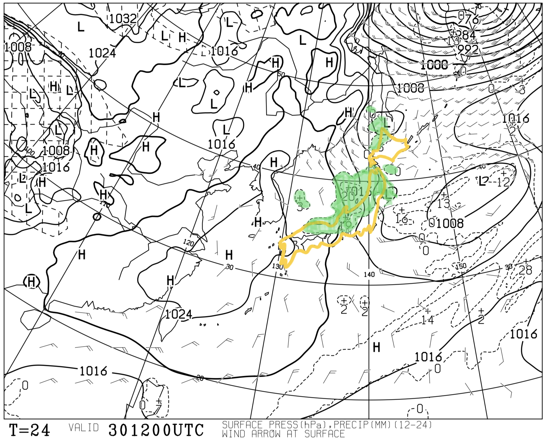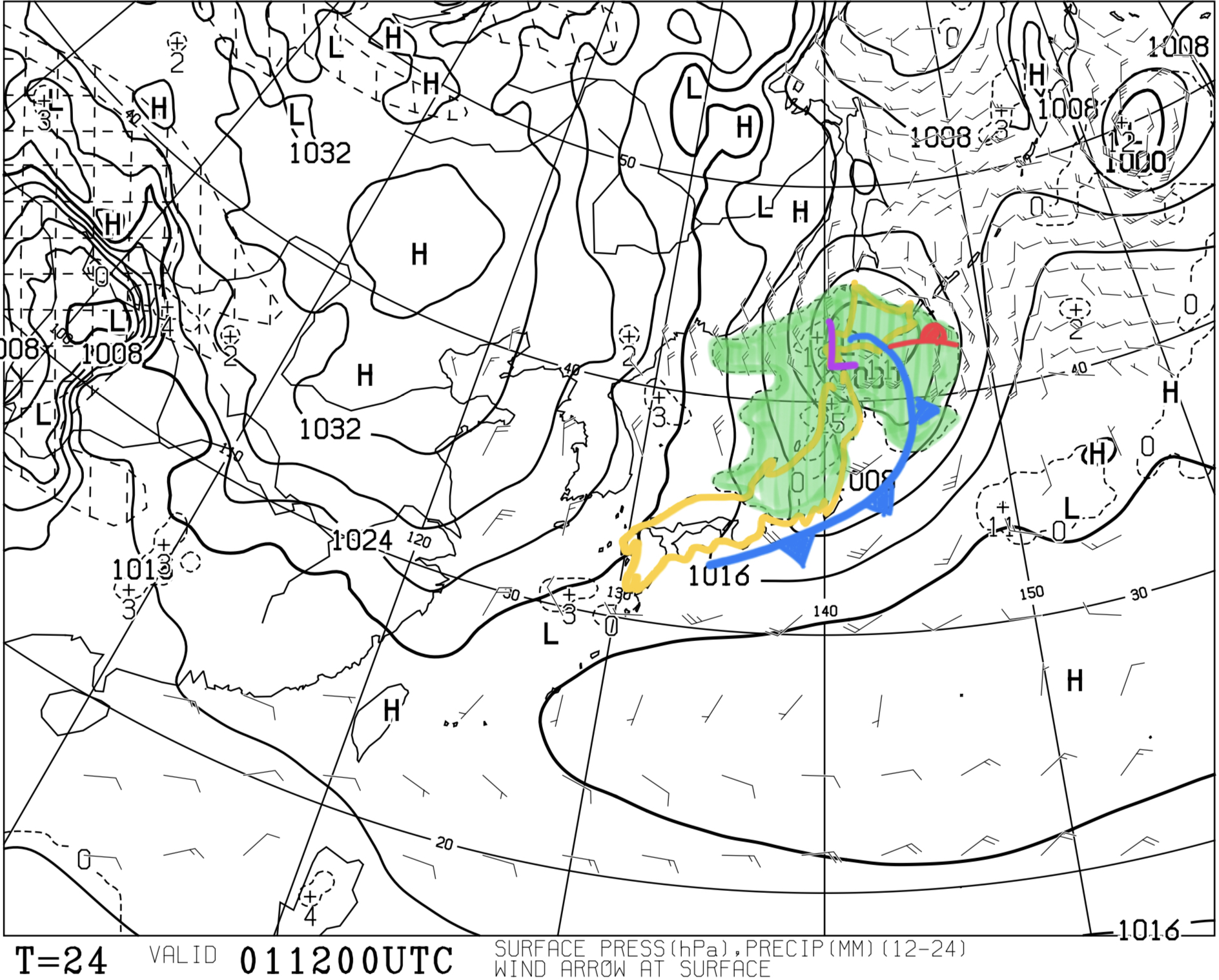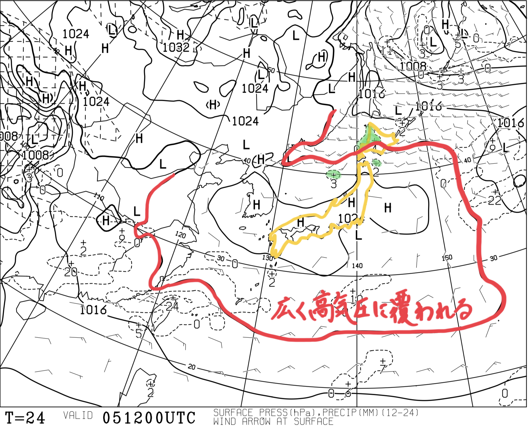 北海道の日本海側を除き、全国的に好天へ向かう。地上(等圧線・前12時間降水量)広く高気圧に覆われる。高気圧の外縁にあたる北海道と南西諸島では若干の降水が予想されるものの、弱い雪か雨となる。総じて山日和ではあるが雪崩や雪庇の融解に注意したい。...