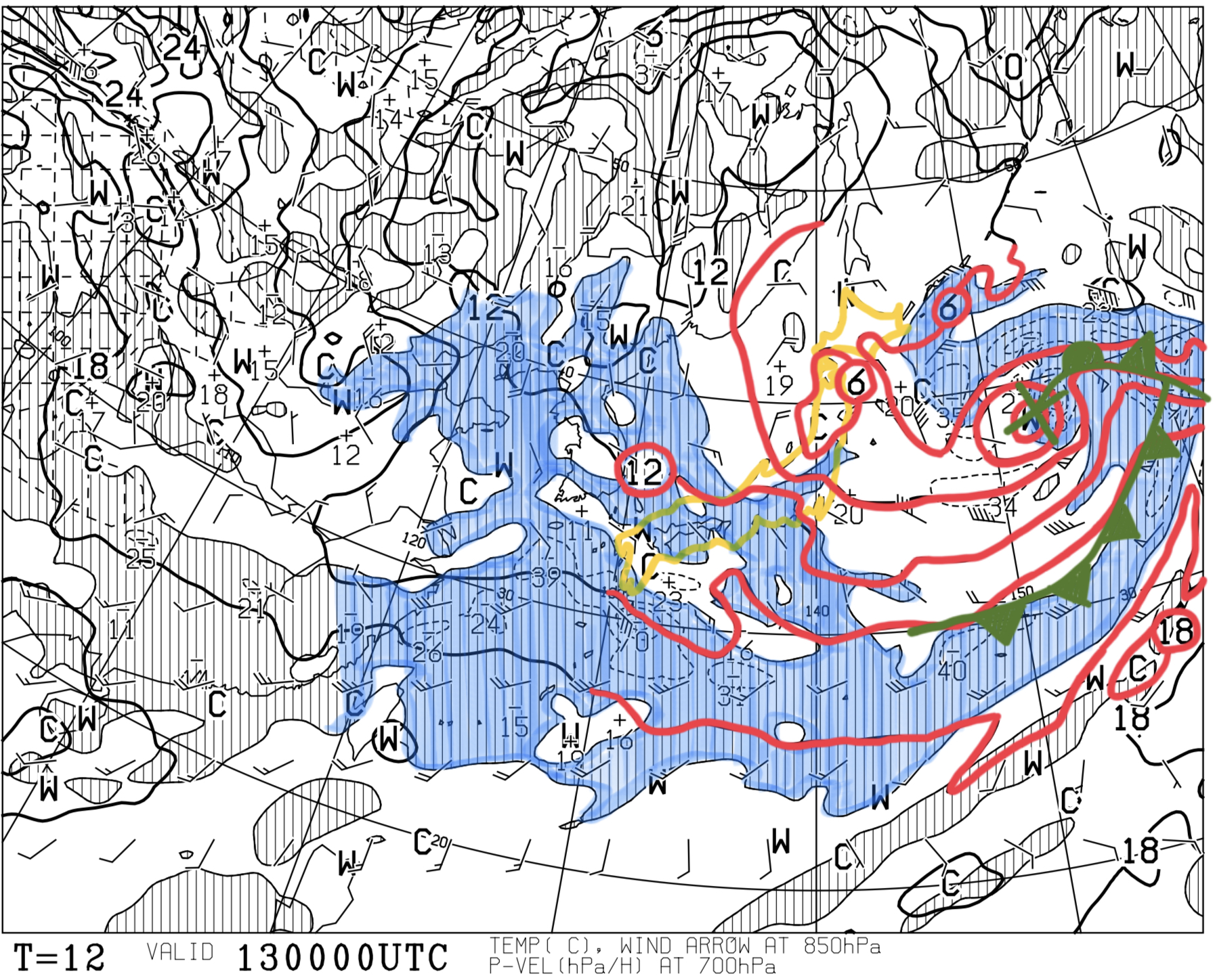 中国地方東部より北の日本海側で雪。北陸地方では局地的に降り方が強くなる時間帯もある。地上(等圧線・前12時間降水量)等圧線の間隔は広くなり西高東低の気圧配置は緩むが、寒気が南下しているため日本海側の広い範囲で雪となる模様。850 hPa(等...