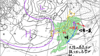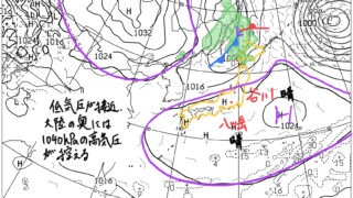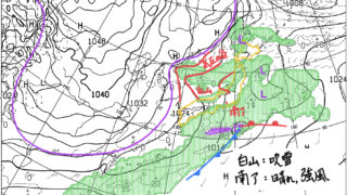 【今日の予想対象山域:中央アルプス・北関東山域】地上(等圧線・前12時間降水量)低気圧が通過し、大陸から高気圧が張り出すため冬型が緩む。全国的に回復傾向にある。中アでは、朝の内は低気圧の通過により南西の風が吹いて雲が残る可能性があるが、日中...