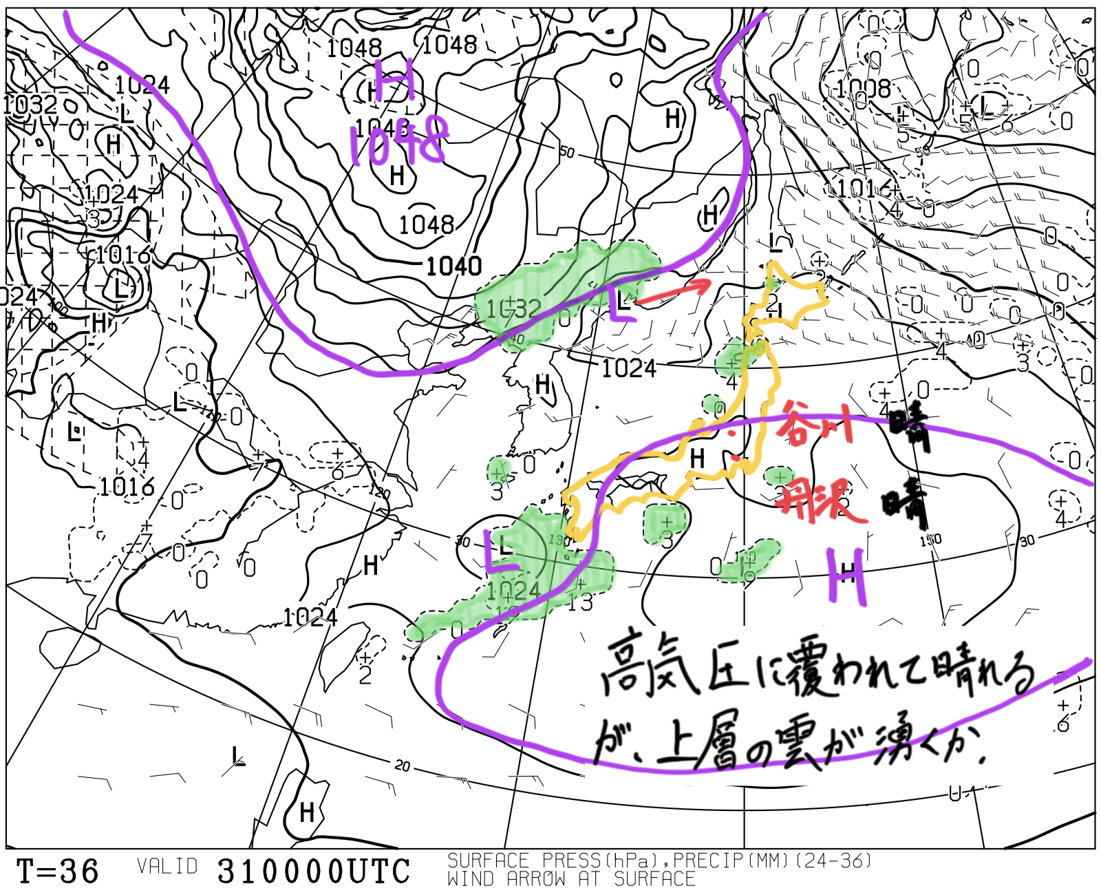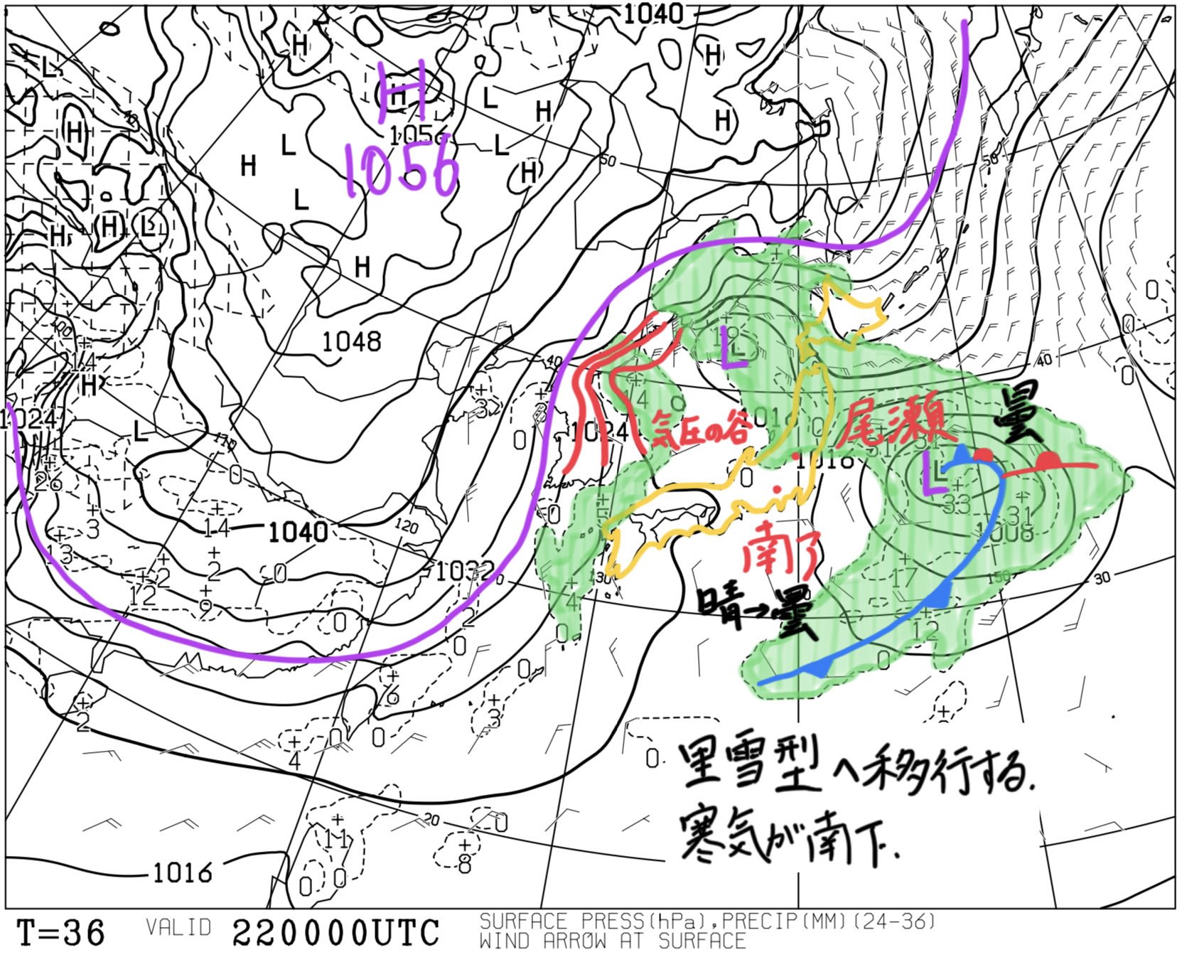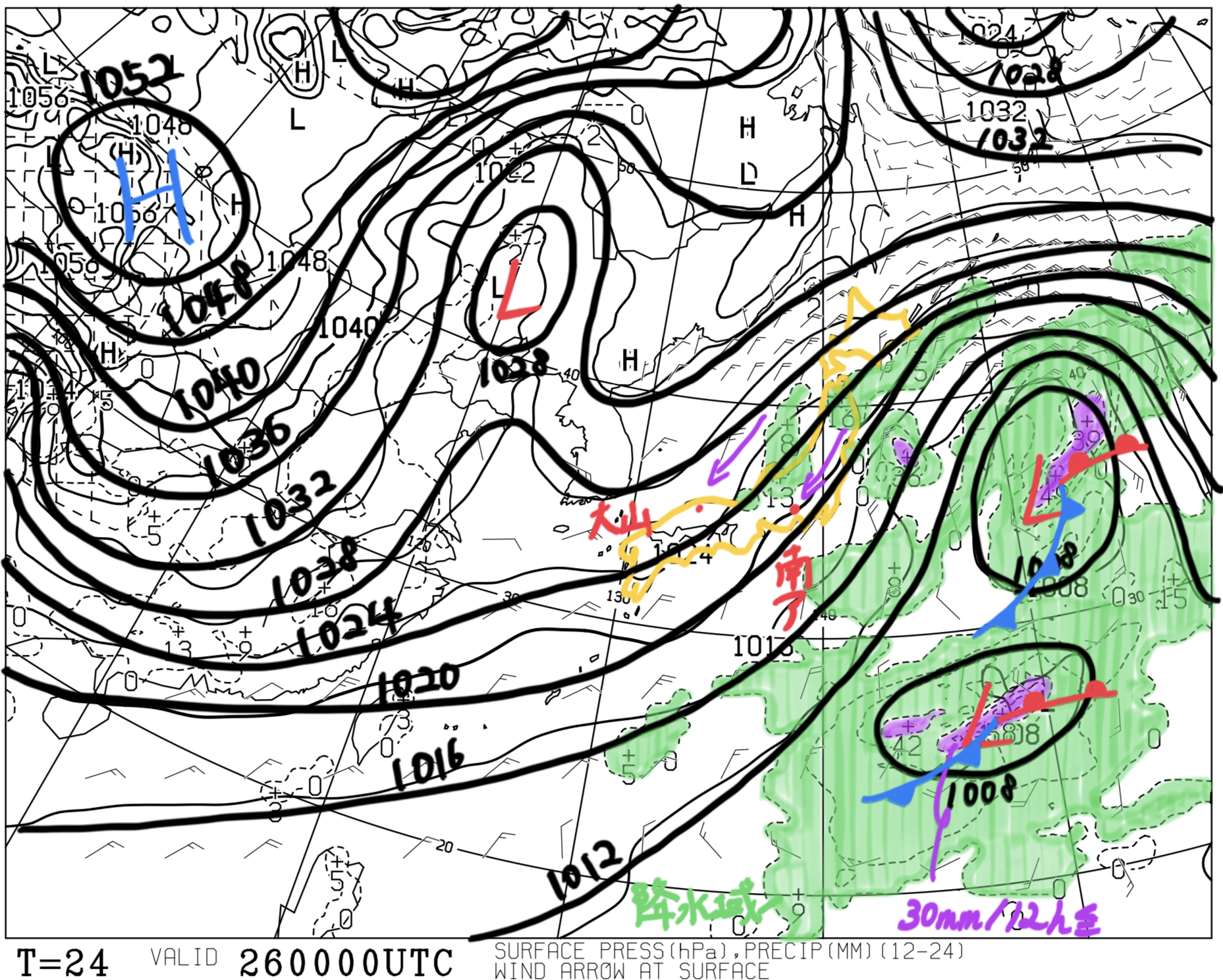 【予想時刻T=0 : 2025/01/25 09:00】地上(等圧線・前12時間降水量)状況:大陸に1052 hPaの高気圧がある。太平洋に低気圧があって、日本列島付近の等圧線は混んでいる。考察:等圧線の走向から、地上付近では北~北東の風が...