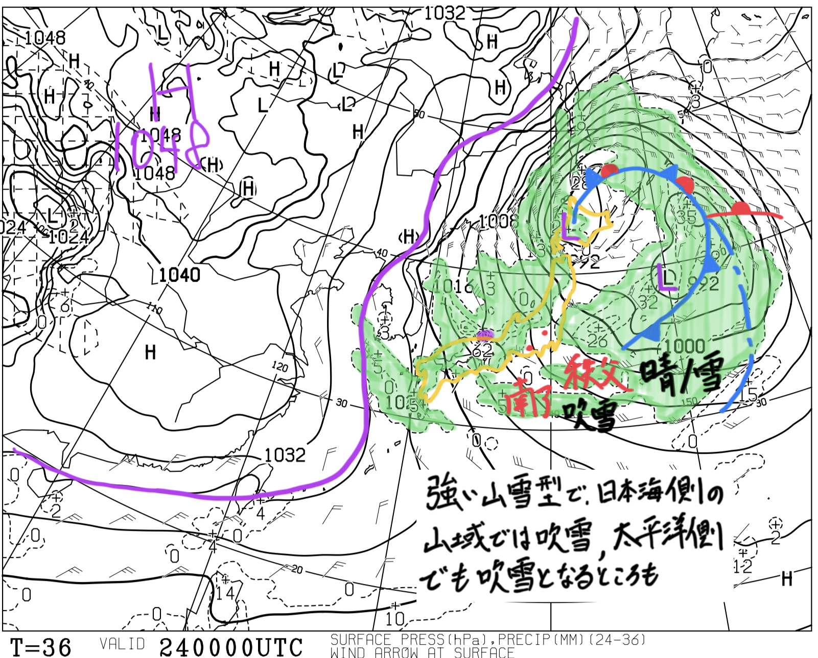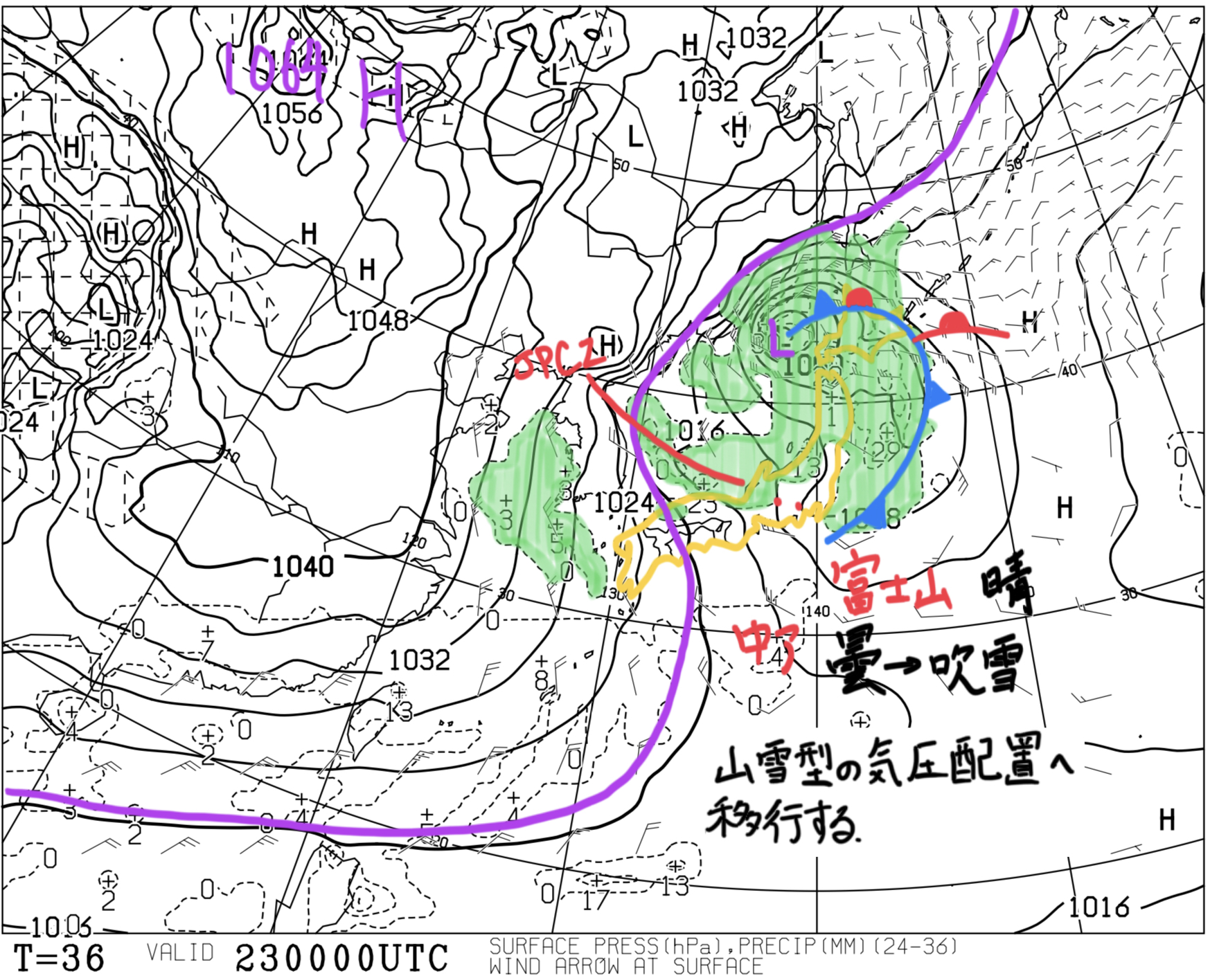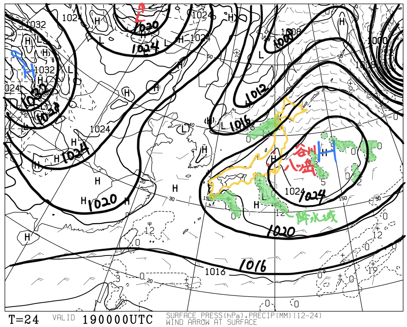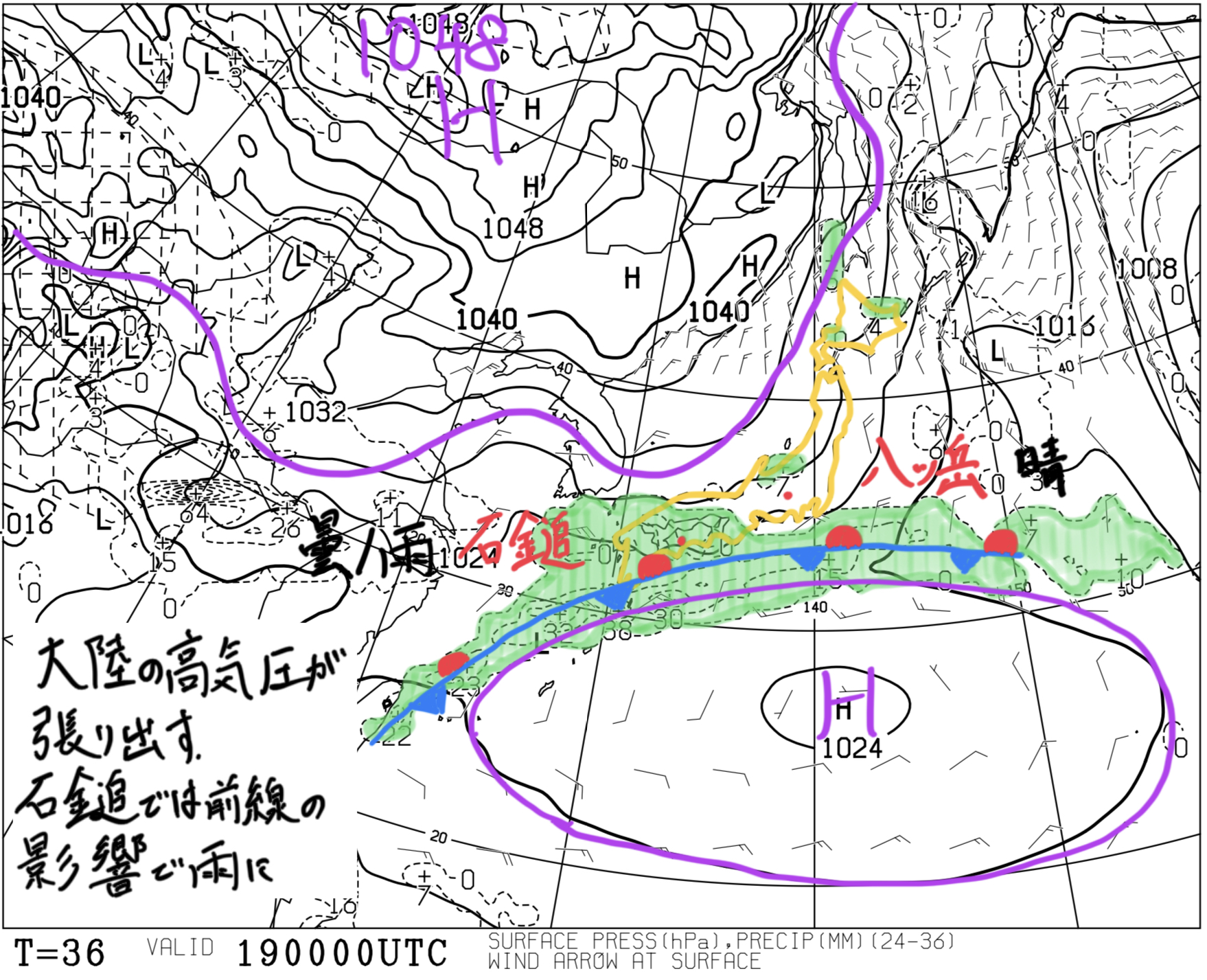 【予想時刻T=0 : 2025/01/25 09:00】地上(等圧線・前12時間降水量)状況:大陸に1052 hPaの高気圧がある。太平洋に低気圧があって、日本列島付近の等圧線は混んでいる。考察:等圧線の走向から、地上付近では北~北東の風が...