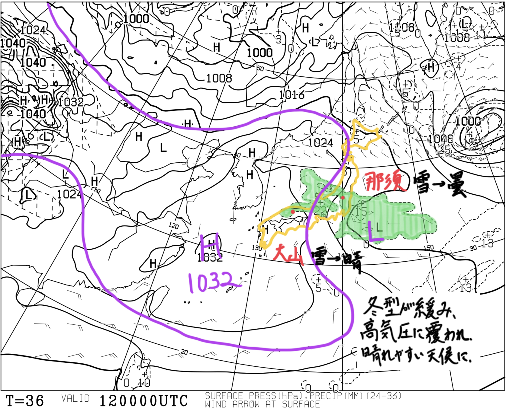 【予想時刻T=0: 2024/05/03 21:00】地上(等圧線・前12時間降水量)引き続き高気圧に覆われるため全国的に晴れる予想だが、西から天気は崩れていく。大山では概ね晴れるが、夕方以降風が強まる。越後では晴れて風も強まらない予想。5...