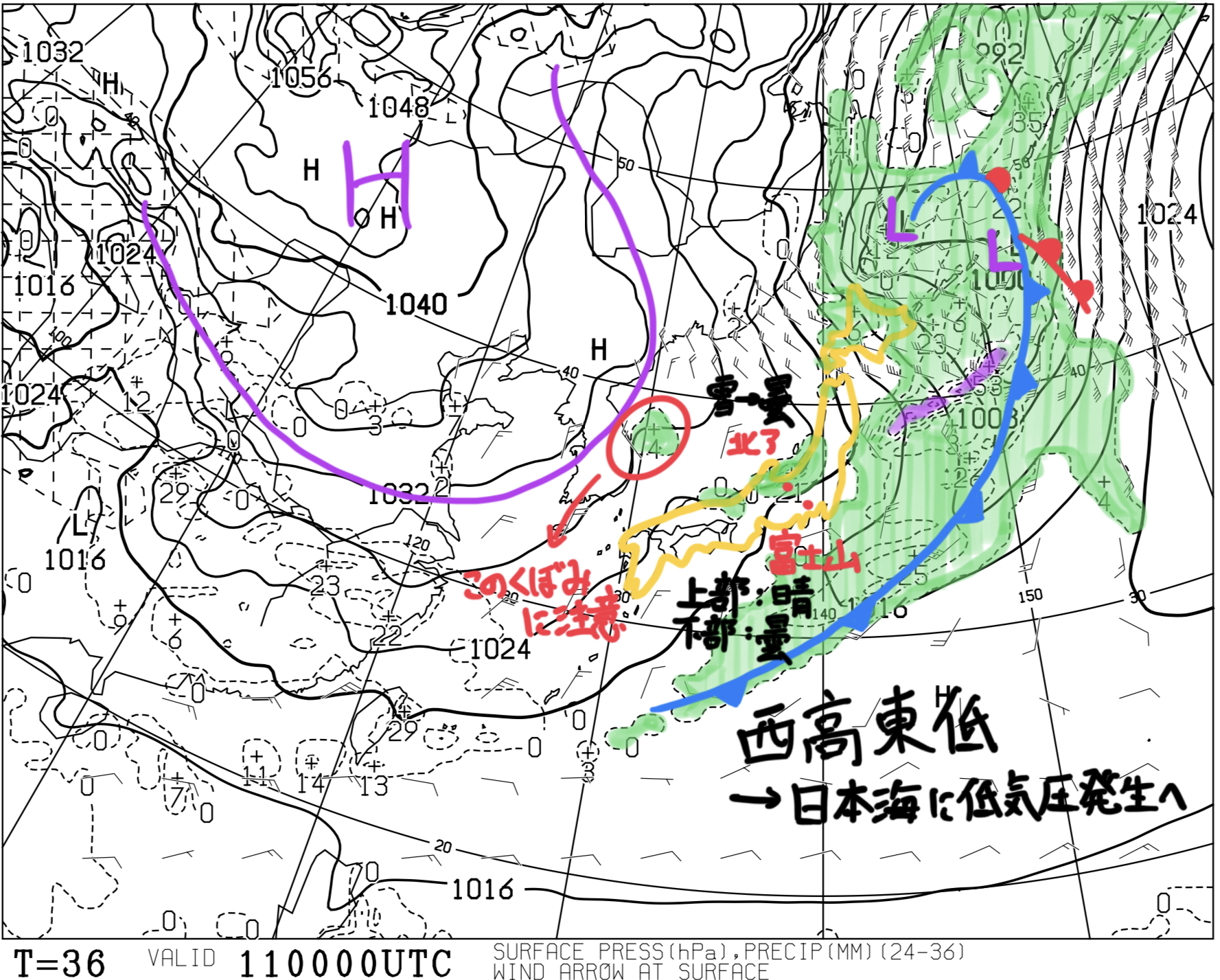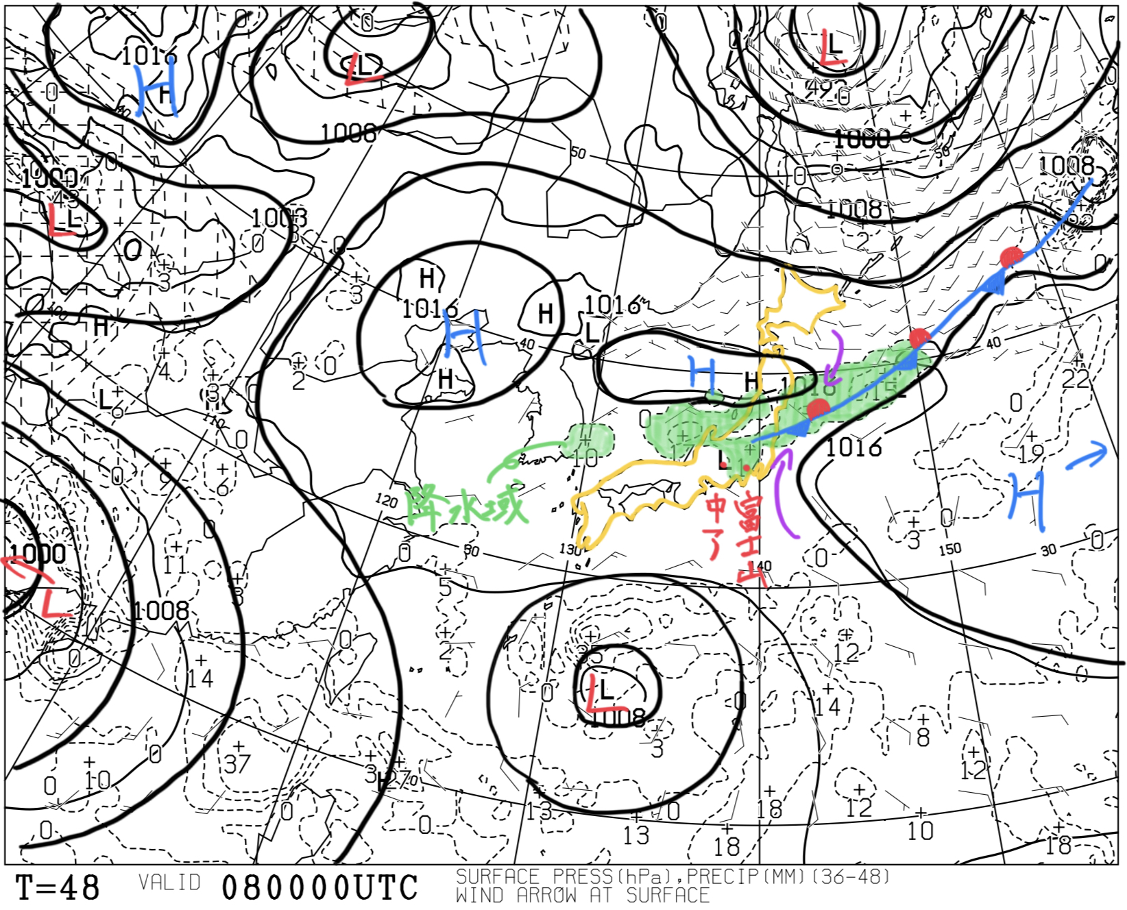 【予想時刻T=0: 2024/09/05 09:00】地上(等圧線・前12時間降水量)高気圧が連なっているが、太平洋高気圧と大陸の高気圧の間は南風と北風がぶつかるため前線が形成されていて、前線付近では雨雲が発生している。ただ、高気圧による風...
